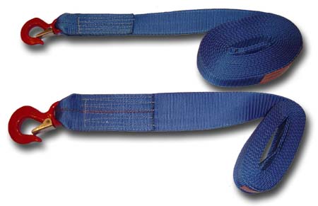 These straps are made in 2 sizes. 2" and 3" wide by 15 feet long. The straps have a sewn on hook and a loop at the opposite end.